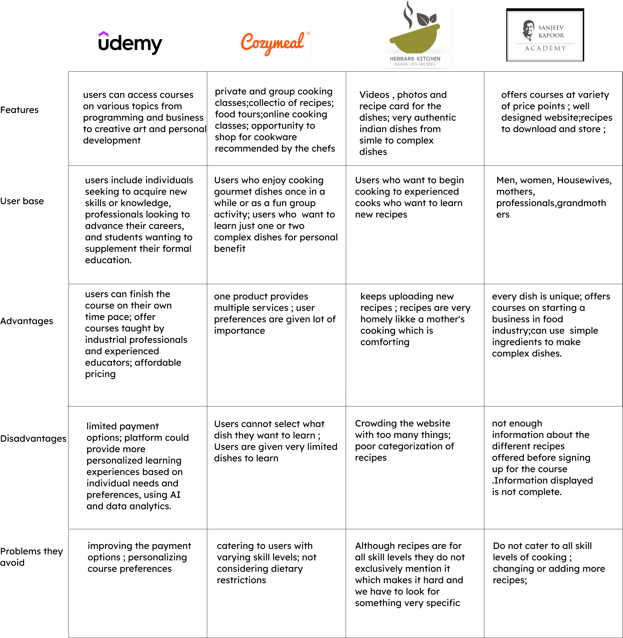 For this analysis, I chose four representative cooking websites: Sanjeev Kapoor Academy, Hebbar's Kitchen, Cozy Meal, and Udemy.