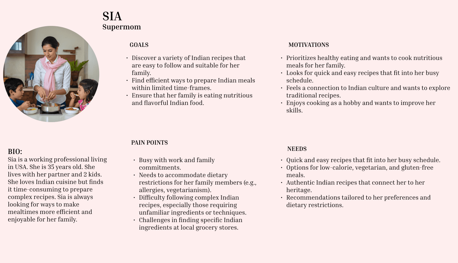 Interview participants primarily comprised of 5 busy individuals lacking the time to consistently prepare full Indian meals. Due to scheduling limitations, I conducted one in-depth video interview and supplemented it with email questionnaires from other participants